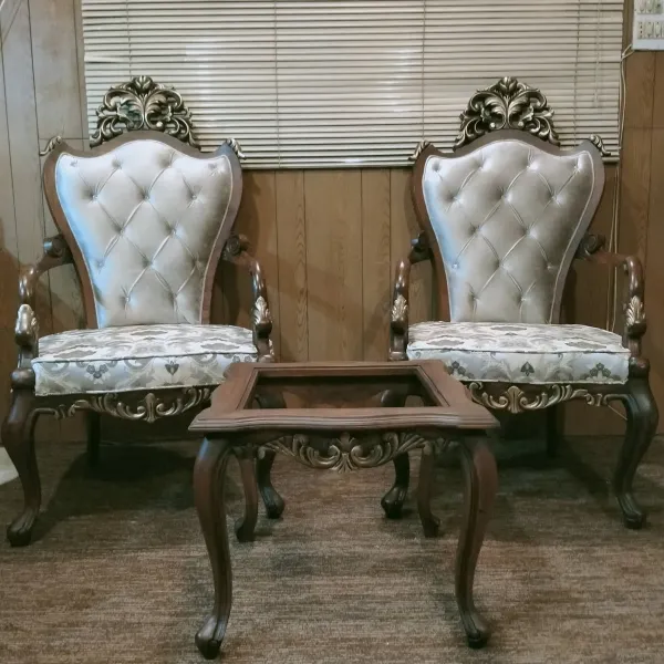 * Made up of Solid Seasoned Rosewood/Sheesham Wood. * Intricate Hand Carving (depends on design) * High Quality of Wooden Polish/Deco with High End Matt/Gloss Finish. * Wide Ranges of Scheme for Deco and Polish, Customize according to your theme. * 10-year Warranty Foam is used * High Quality Fabric used, along wide range of variety and schemes. * Chair Set consist of 2 Chairs and a Coffee table. * Glass/Marble Top placed on coffee Table. Contact us Now for Customization, from sizes to theme. Get everything of your Choice.